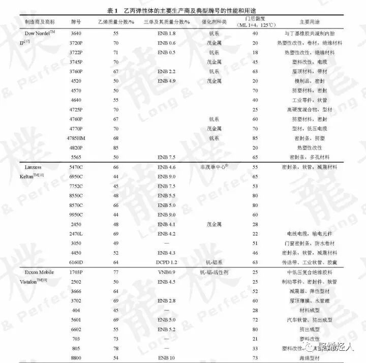 迄今,全世界已有十多家公司生产各类乙丙弹性体,品种牌号多达100余个。表1列出了世界最主要的乙丙弹性体生产商及其典型的产品。