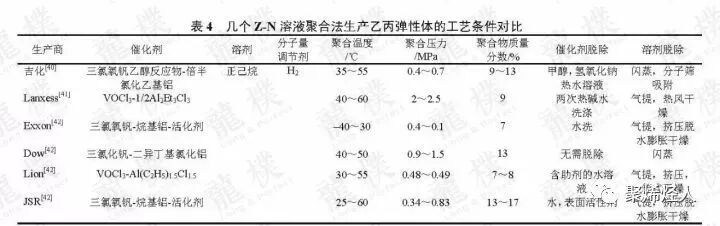 传统Z-N催化剂催化的乙丙弹性体溶液聚合温度不高,这是因为生产的乙丙共聚物几乎完全无规,分子链中不含可结晶的链段。为了使催化剂的活性和共聚性能处于最佳状态,同时又容易撤除反应热,聚合温度一般选择在40~70℃。这就导致了反应器内聚合物的浓度相对较低,以避免因黏度过高而影响体系的混合与传热。但Z-N催化剂的活性毕竟较低,因此传统乙丙弹性体的生产往往需要对聚合后的产品进行催化剂的洗脱处理。目前各公司传统乙丙弹性体生产的溶液聚合工艺条件大致相似,但催化体系、溶剂和催化剂脱除方法则不尽相同(见表4)。