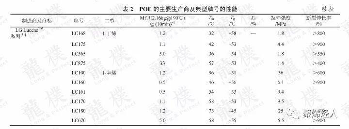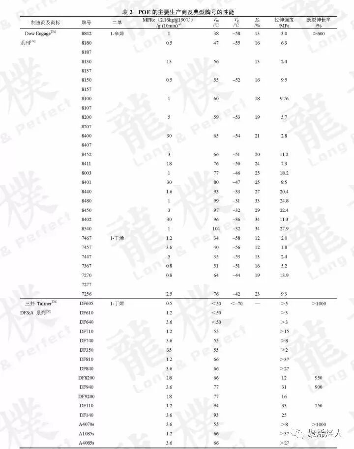 随后,ExxonMobil、Lyondellbasell、LG化学、住友化学、三井化学等也开发了类似的产品。目前全世界POE的年产量已超过了100万吨。表2列出了世界最主要的POE生产商及其典型产品。