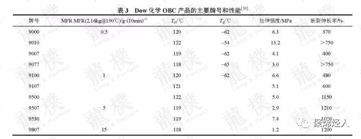 该产品同样以乙烯与1-辛烯为原料,但具有明显软硬段交替的多嵌段结构。OBC既有高的熔点,又有低的玻璃化温度,且比POE有更高的结晶速率、更规则的结晶形态。因而其耐热性能强于POE,在拉伸强度、断裂伸长率和弹性恢复等方面均表现出更优越的性能,不仅具有聚乙烯易加工的特点,又具有烯烃无规共聚物和共混物难以实现的刚性与韧性平衡。OBC的优异性能已越来越得到国内外学界和工业界的认同。表3为Dow化学OBC产品的主要牌号及性能。
