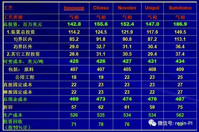 可以看出几种工艺的投资和生产成本相差不大,表明主流聚丙烯工艺技术的经济性非常接近。