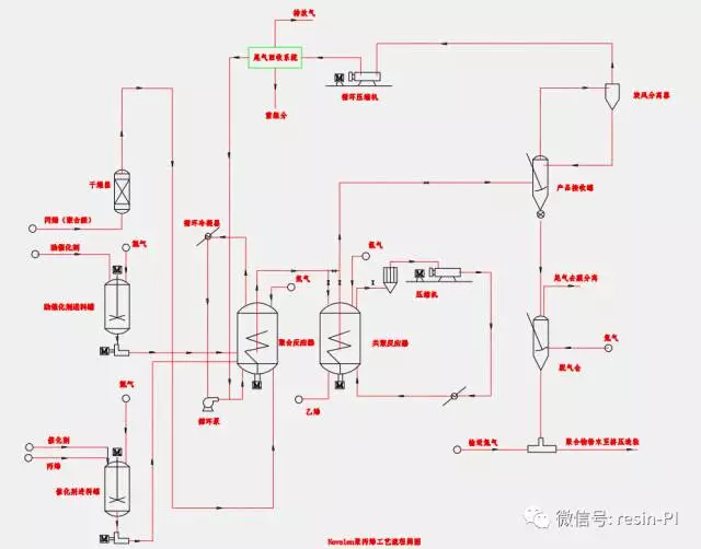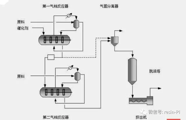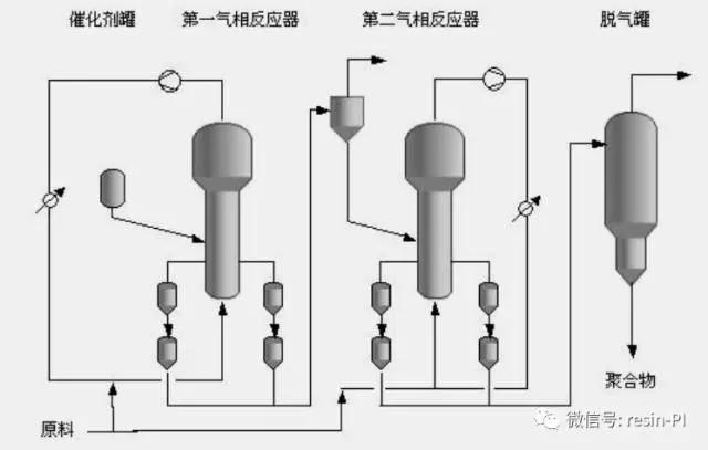 Chisso工艺的第一反应器布置在第二个反应器的顶上,第一反应器的出料靠重力流入一个简单的气锁装置,然后用丙烯气压送入第二反应器。而Innovene气相法工艺的两个反应器平行水平布置,第一反应器的出料靠压差送入高处的沉降器,分离出的未反应气体经压缩机压缩升压,冷凝后循环回反应器,聚合物粉料靠重力进入气锁器,用丙烯气压送入第二反应器。