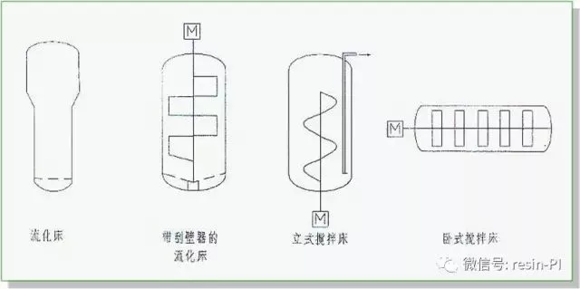 各种气相法工艺的反应器型式可分为流化床、带刮壁器的立式流化床、立式搅拌床、卧式搅拌床四种类型,见下图。