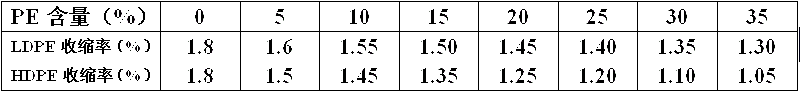 以在PP中加入PE树脂为例,不同含量PE对PP收缩率的影响见表9所示。