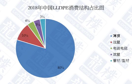 LLDPE消费量79.7%应用于薄膜。如,日常包装、冷冻包装、重包装、垃圾袋、弹性包装物、工业用衬套、巾式衬套和购物袋、地膜、棚膜等。LLDPE防渗漏地膜是一种大型挤出片材,用作废渣填埋和废物池衬垫,防止渗漏或污染周围地区。