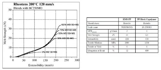 由上图表可知,熔体强度大小为:中石化均聚型高熔体强度PP(HMS 20Z)>进口HMS PP >普通PP。