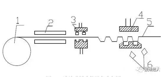 连续进料式的设备流程图:1-片料卷;2-加热器;3-模具;4-切边;5-废片料;6-制品。