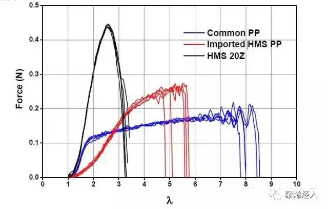 中石化均聚型高熔体强度PP(HMS 20Z)、进口HMS PP、普通PP的熔体强度
