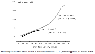 高熔体强度聚丙烯:HMSPP具有较高的熔体强度,在熔融拉伸时存在应变硬化现象,加工温度范围较宽。熔体强度的定义为:熔融拉伸时,聚合物熔体在断裂之前所能承受的最大应力。在相同熔融指数下,HMSPP比普通PP熔体强度要高的多(HMSPP一般熔体强度大于10cN,普通聚丙烯为2-4cN)。下图是通过支链化得到的HMSPP与线形PP的对比:与普通PP相比,HMSPP的MS高于线性PP的MS,表现出明显的应变硬化现象,其剪切变稀更明显。