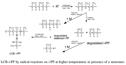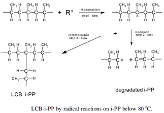 首先,自由基分子夺取了聚丙烯链上的一个氢,形成了带有自由基的聚丙烯链。第二步,在活泼的带有自由基电子的碳原子的位置发生了β断键的反应,聚丙烯被降解。第三步,已经存在的端部带自由基的聚丙烯链与第一步的未发生断链反应的聚丙烯链偶合,从而形成长链支化聚丙烯。