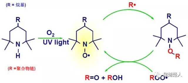 它们本身不吸收任何大于260 nm的光线,也不能猝灭激发态分子,但在氧存在下,受阻胺能被氧化生成相应的氮氧自由基,这种化合物相当稳定,它们能非常有效的捕获聚合物光氧化降解产生的活性自由基,而且在稳定过程中具有再生功能,这种再生功能是其有别于其他稳定剂的最大特征。