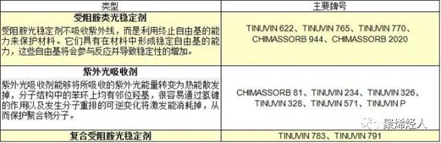主要牌号:Tinuvin 622、Tinuvin 765、Tinuvin 770、Tinuvin 944、Chimassorb 2020等。